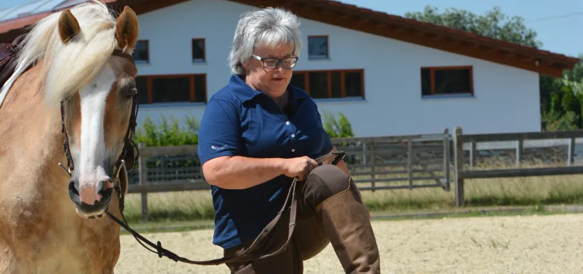 Sibylle Wiemer empfiehlt ihren Schülern, einfach während sie ihr Pferd führen zu hopsen. So geht auch das Pferd schon mal Schritt, und zwischendurch kann der Schüler nachgurten. Schwierigkeiten gibt es selten: „Die Pferde nehmen viel Rücksicht dabei, sie gehen fast alle automatisch langsamer, das ist ganz süß anzusehen!“ erzählt sie. „Manche von ihnen spiegeln ihre Menschen so sehr, dass sie probieren, auch ihre Vorderbeine anzuheben“, sagt sie und lacht.