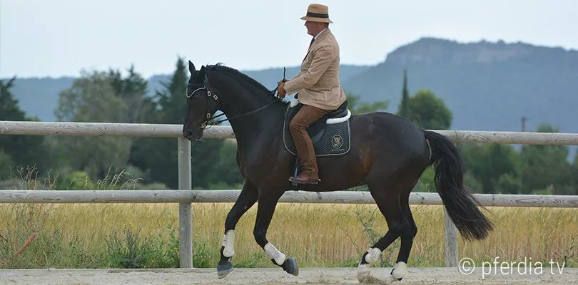 Philippe Karl, der sich der Schule der Légèreté verschrieben hat, erklärt im Kurs Schule der Légèreté: Gymnastizierung genau, wie der Reiter sicherstellen kann, dass das Pferd korrekt einspringt. Er hat einen Tipp für Pferde, die auf einer Hand besonders große Schwierigkeiten haben, richtig anzugaloppieren. Er arbeitet im Schritt auf dem Zirkel, und lässt das Pferd im Travers gehen. So wird die Hinterhand nach innen geführt. Der Reiter sitzt außen, „und dadurch wird das Pferd in 90 Prozent aller Fälle innen korrekt angaloppieren!“