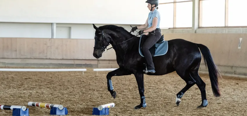 Stangengassen: Diese klassische Übung trainiert die Propriozeption und fördert eine gleichmäßige Schrittlänge. Für Anfänger reichen 4-5 Stangen im Schritt, fortgeschrittene Reiter können die Abstände variieren oder im Trab arbeiten.