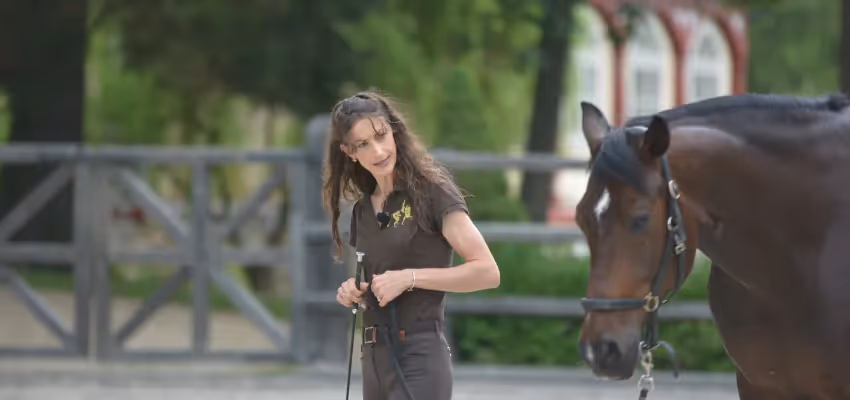 Lisa Röckener startet zu Anfang mit der Konditionierung des Pferdes auf bestimmte Wörter, Laute und Tonfälle, denn Pferde sind tatsächlich fähig, diese ganz genau zu unterschieden. Erst sobald darauf eine Reaktion folgt, wird Neues hinzugenommen: So ist das Rückwärtsgehen ohne Körpersprache, nur mit der Stimme, eine der ersten Übungen. Danach wird der Fokus auf die Körpersprache gelegt mit dem Ziel das Pferd nur mit der Körperhaltung in eine Volte einzuladen. Aber Schritt für Schritt.