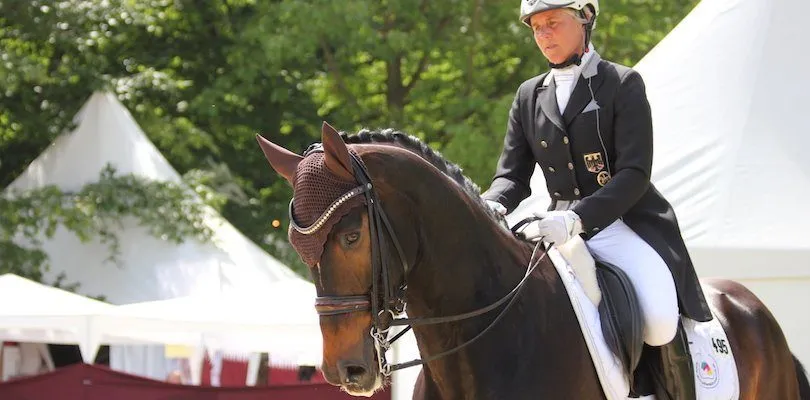Für dein Pferd ist eine weiße Schabracke vorgeschrieben, eine Fliegenhaube ist optional. Deinen Sattel und das Zaumzeug solltest du vor deinem Start einmal putzen, damit es sauber ist. Zusätzlich ist die Kopfnummer an der Trense oder der Kandare, abhängig von der Dressurklasse, immer Pflicht. Eine gebisslose Zäumung ist im Übrigen nicht erlaubt, das gleiche gilt für jeglichen Beinschutz in der Prüfung. Bandagen oder Gamaschen darf dein Pferd nur auf dem Abreiteplatz tragen, zur Prüfung musst du sie dann wieder abnehmen.