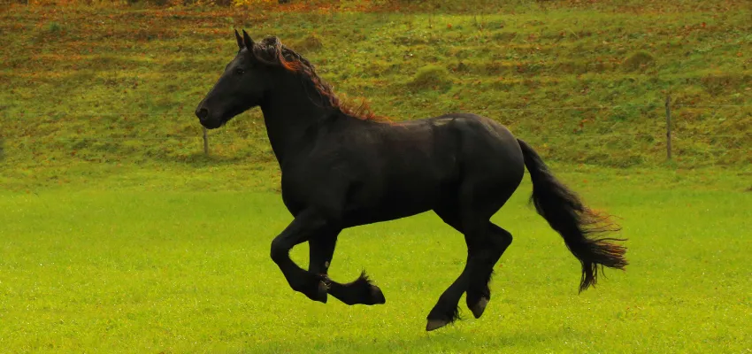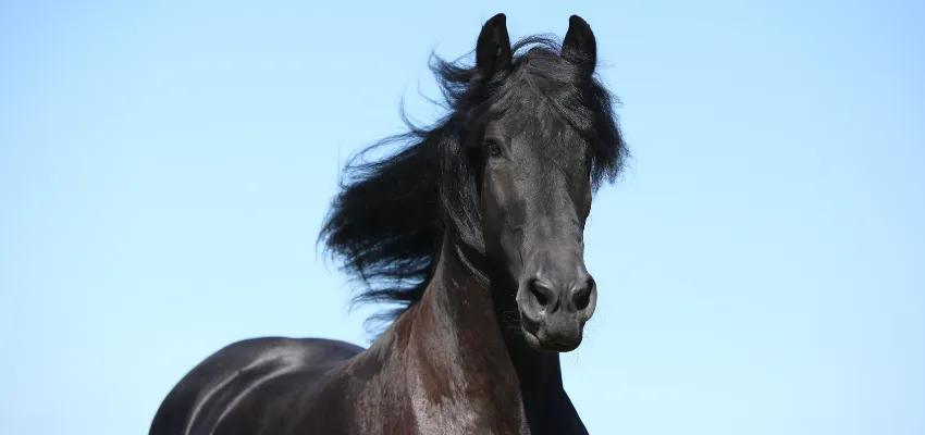 Was einen Friesen unverkennbar macht, ist sein glänzendes und tiefschwarzes Fell in Kombination mit seiner langen, fließenden Mähne und seinem voluminösen Schweif. Außerdem verfügt er über einen langen und dichten Fellbehang an den Fesseln. Aufgrund dessen werden Friesen auch “Langhaarpferde” genannt.
