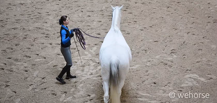 Um zu zeigen, zu welcher Seite das Pferd steif ist, zeigt sie es auf Kappzaum an der Longe. Auf der linken Hand versucht Generale Cassa sich nach innen, also nach links, hohl zu machen. Auf der linken Hand longiert, schaut er also gern nach innen und drückt über die Schulter nach außen. So bewegt er sich gern auch im Freilauf, erzählt die Ausbilderin, als ob die Enden des Pferdekörpers stetig nach links drücken. Dadurch ist es an der Longe und beim Reiten anspruchsvoll, eine korrekte Zirkellinie zu halten, denn das Pferd drückt über die Schulter nach außen.