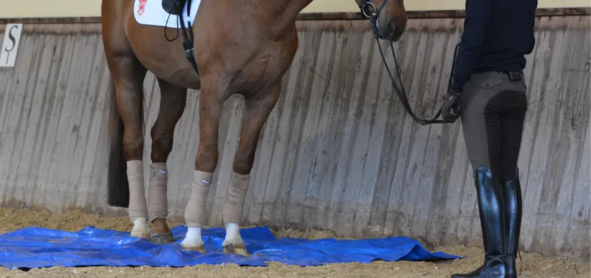 - Planen: Auf dem Boden auslegen und mit deinem Pferd darüber laufen. Enden mit Stangen beschweren, damit sie liegen bleiben.