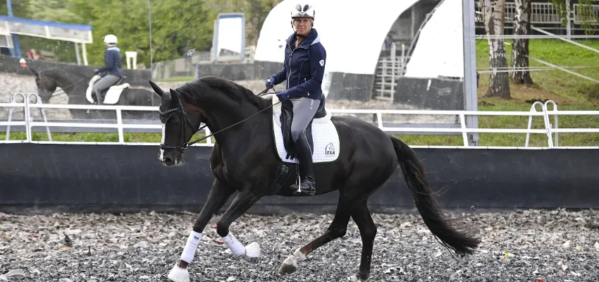 Ihr Berittpferd Lenny gehört zur Kategorie: Extrem leicht im Genick und mit einer wenig ideal angesetzten Halsung. Sie sagt, dass lange Zeit „eine A-Dressur-Haltung“ für Lenny am wichtigsten war. Gemeint ist die Höhe der Aufrichtung – diese Haltung war wichtig im Wechsel mit dem tiefen Vorwärts-Abwärts. So war es am besten möglich, ihn vor sich zu bringen und einen guten Zug zur Hand mit aktiver Hinterhand zu entwickeln.