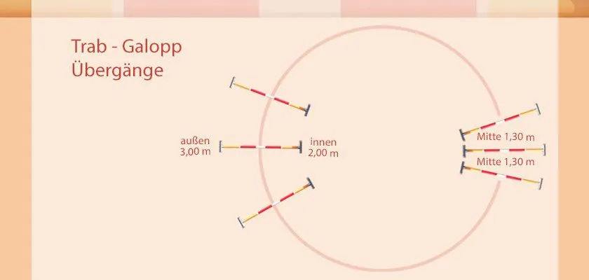Schritt-Stangen und Cavaletti sollten zwischen 0,80 bis 0,90 Meter auseinanderliegen. Dieses Maß gilt für das innere Ende, das zum Zirkel hin ausgerichtet ist. Nach außen hin sollten die Aufbauten etwas auffächern. Diese Angaben gelten für Großpferde. Trab-Stangen und Cavaletti liegen 1,20 Meter bis 1,30 Meter auseinander. Auch hier gilt, dass dies für das innere Ende gilt und sie nach außen hin auffächern. Möchtest Du im Galopp arbeiten, nutzt Du Abstände von 2 Metern innen, nach außen hin aufgefächert auf 3 Meter.