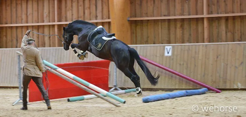 Achtung beim Aufbau der Sprünge: Verwende nur Elemente, an denen die Longe nicht hängenbleiben kann, zum Beispiel Cavaletti-Blöcke. Oder lege Stangen zur Sicherheit an die Ständer, so wie es auf unserem Bild zu sehen ist. Philippe Karl nutzt übrigens einen Kappzaum für diese Longenarbeit.