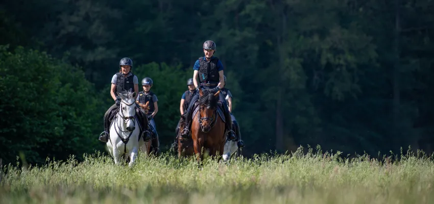 Wenn du die zweite Station erfolgreich abgeschlossen hast, geht es raus ins Gelände. Hier musst du dann zeigen, dass du alle Grundgangarten ohne Begrenzung sicher reiten kannst. Zusätzlich ist das Bewältigen unterschiedlicher Boden- und Geländeverhältnisse, wie z.B. Wasser, Schlamm und Berge Teil dieser Station. Genauso wie dein Verhalten, wenn du auf andere Verkehrsteilnehmer triffst. Die Prüfer achten dabei auch auf dein Verhalten innerhalb einer Ausreit-Gruppe und auf die Kommunikation mit deinem Pferd.