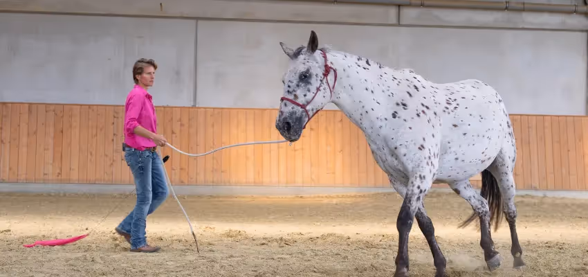 Michaela Kölbl nutzt für die Vorbereitung des eigentlichen Verladetrainings die Bodenarbeit am Arbeitsseil. Sie treibt das Pferd zunächst mit dem Seilende oder der Flag von sich weg und dann um sich herum. Dabei legt sie Wert darauf, dass die folgenden 4 Dinge klappen, bevor es mit dem Pferd an den Hänger geht: