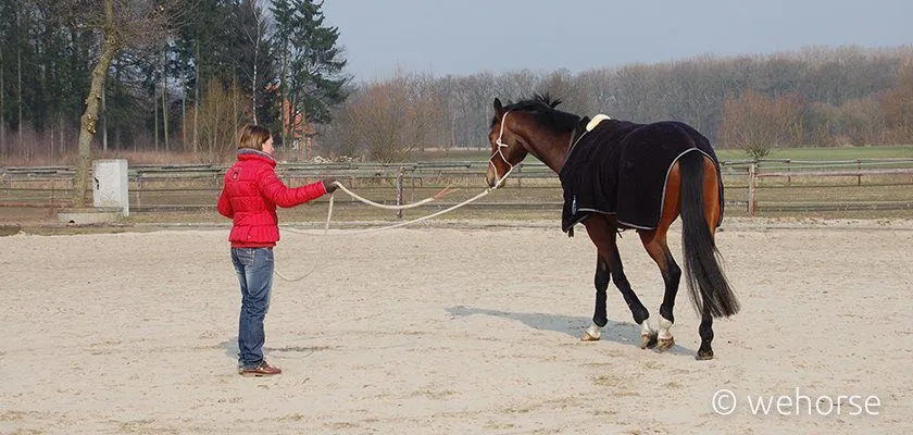 Laufenlassen in der Halle ist nur bei ganz braven Pferden empfehlenswert, die sich dabei so kontrolliert verhalten, als ob sie longiert würden. Die weitere Bewegung kannst Du entweder über das Schritt führen, reiten oder über Laufband und Führanlage abdecken.