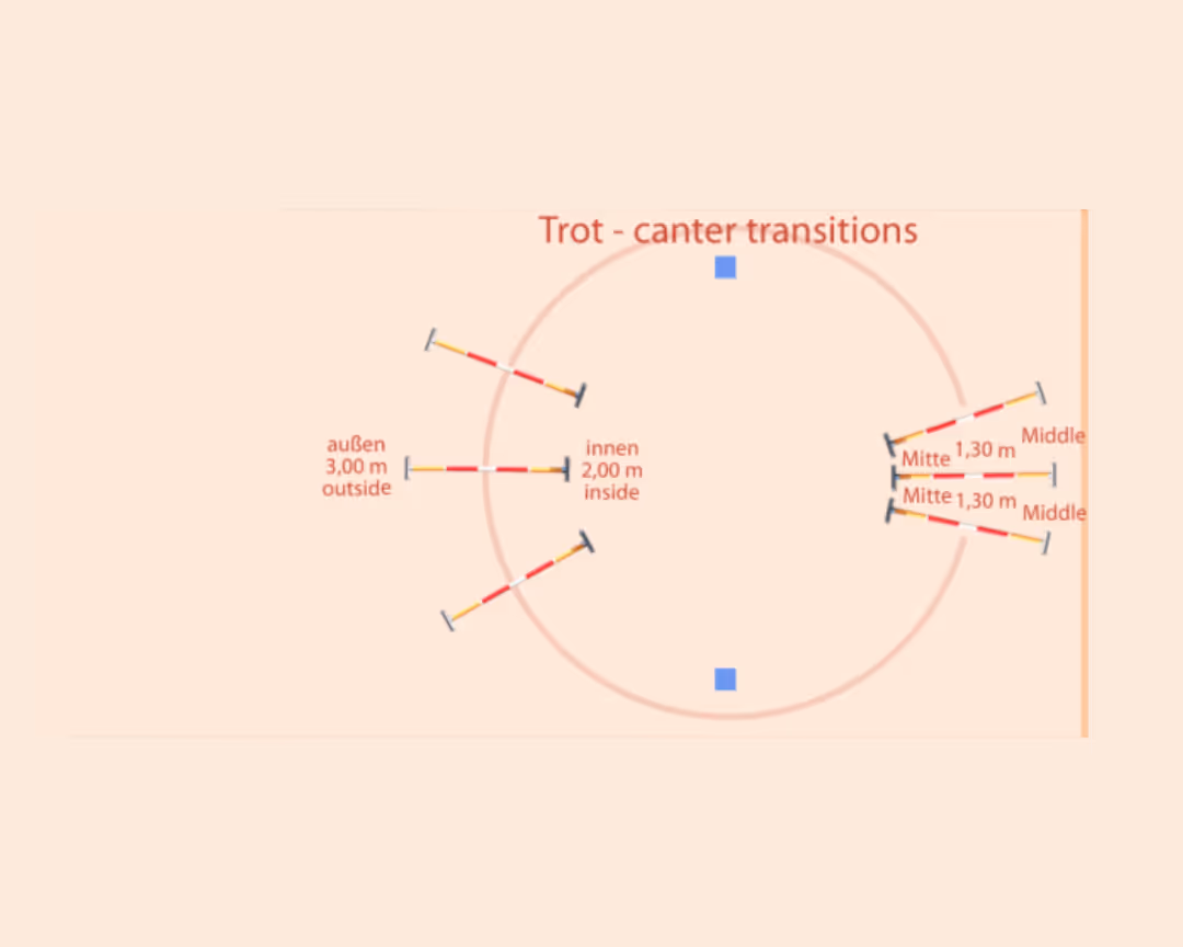 If that goes well, you can venture on to the next exercise. Divide a circle in half and on one side set up four trot Cavaletti with the same measurements as in exercise 2 (if you imagine the circle as the face of a clock, put them at 9 o'clock). On the other side, you build four canter Cavaletti (at 3 o’clock). Mark half of the circle at 12 o’clock and 6 o’clock as transition points. Before the canter Cavaletti you canter at the transition point, after the canter Cavaletti you transition at the next change point to the trot and ride over the trot Cavaletti.