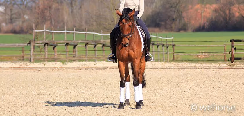 The Werndl siblings use a tactical strategy to make learning dressage halts easier. 'For spooky horses that don’t relax easily, we practice halts in a calm environment, for example at the end of a training session.' The horse should learn to associate dressage halts with a pleasant experience. 'After getting on, I like to give him a little sugar. The horses quickly learn to remain still until they get sugar.' For young horses it’s easier to have them stand at the wall than on the center line or the second track. When the horse learns to stand at the wall, Werndl will then leave the first track. 'The wall is useful as a boundary element. I’ll move away from it later, and go to either the second track or the center line. The important thing is that I halt on a straight line.'