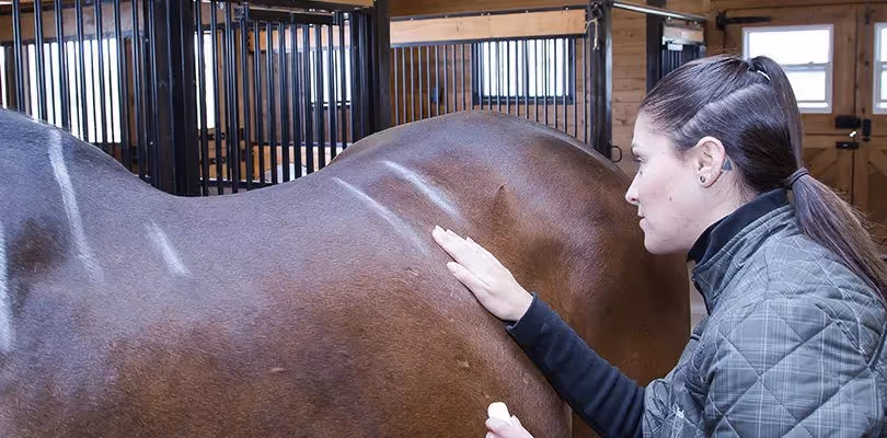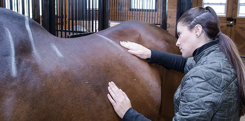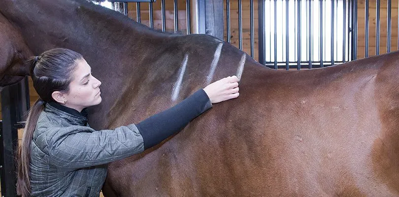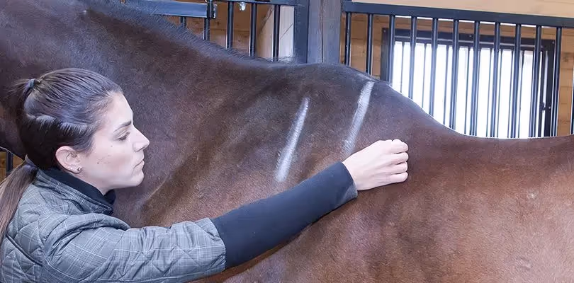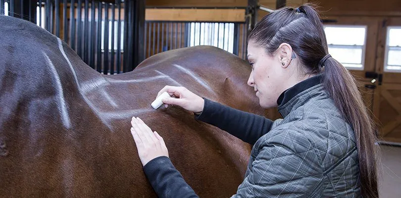 Measure ten centimetres from this vertebra chalk mark in the direction of the hips (a little more than a normal hand-width). Here, mark another line going downwards. One finds the explanation for the sensitive area within these ten centimetres in Jochen Schleese’s book: “This area, the lumbar region, is where the horse’s bucking reflex point is located. If the saddle is too long and covers this area, it may be the cause for passes, four-beat canters, extra steps during flying changes, bad behaviour and bucking.