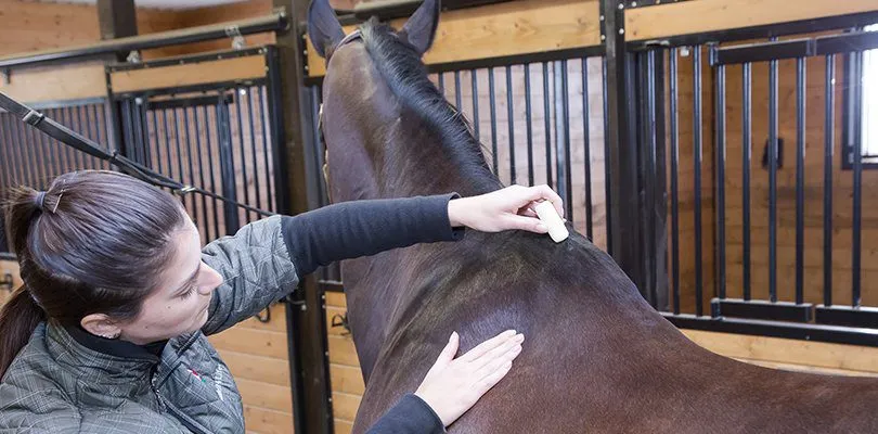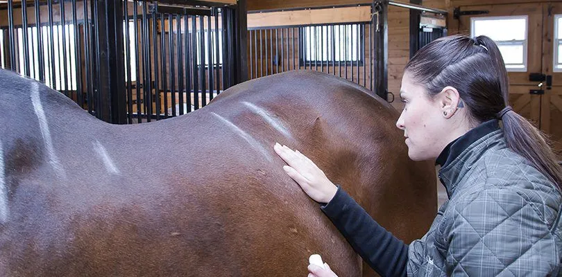 This step is a little bit more complicated, so you may need an assistant. Because the front leg on the side where you’ll be marking will be lifted, and pulled forwards – not backwards, like when shoeing a hoof. This makes the shoulder blade move. The shoulder will rotate towards the back. Make your third mark exactly at the furthest spot where the shoulder blade moves.