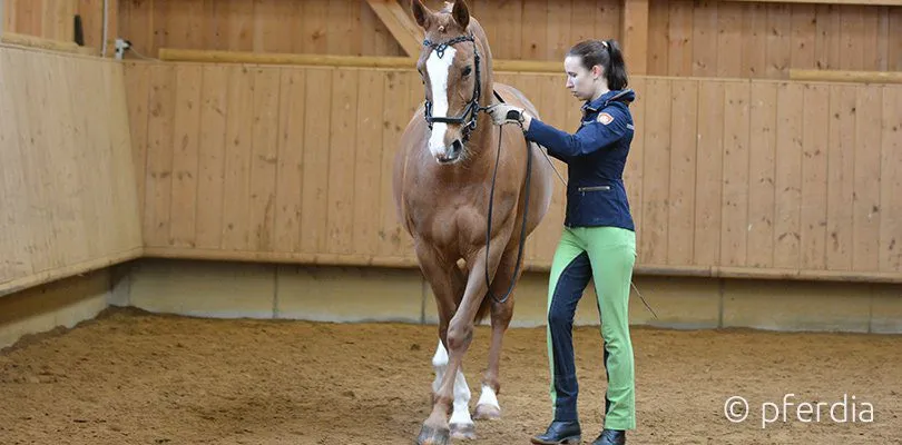 Kathrin Roida leads her horses at shoulder height so that the horse can see her gestures. No pulling! When stopping, the trainer pulls her own shoulders back slightly and closes her legs with her feet together.