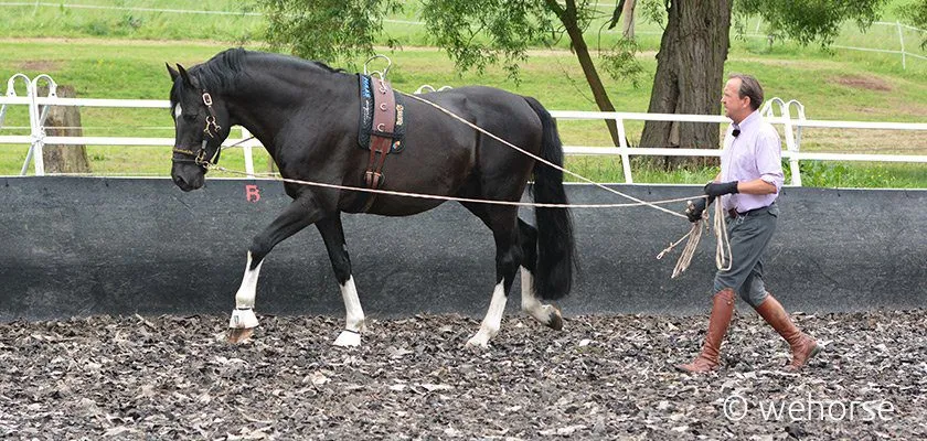 The horses know the kissing sound as a signal for going forward from their groundwork. ‘At the beginning, we ride Australian style, with the legs very far forward’, says Schneider. The horses are already accustomed to the reins from their work in the long reins. It’s important that the lead goes over the withers instead of behind the croup, like in traditional long-reining. He likes to use a grab strap to secure the outside rein and lets the inside rein hang free. ‘In an emergency I can let go of the outside rein and turn the horse’s head to the inside’ – this works as a kind of emergency brake.