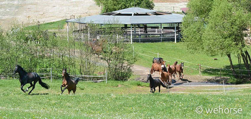 At home, Stefan Schneider and Uta Gräf subscribe to natural horsekeeping - all horses go out to pasture. This too contributes to a well-balanced horse, and is one element of the whole package. The image above shows some of their horses, which even as sport horses are turned out with the herd.